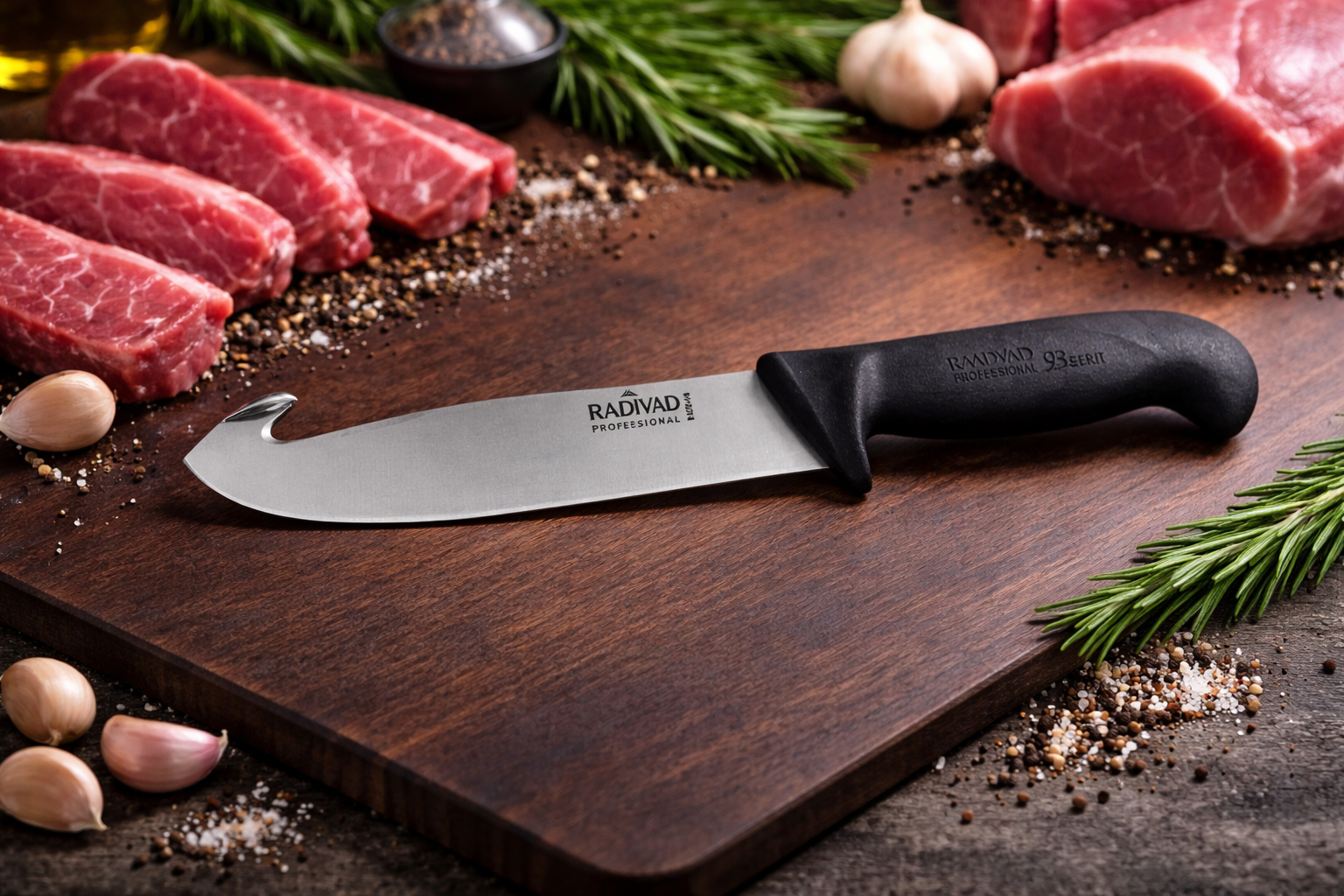 Professionell slaktkniv avsedd för yrkesbruk, utrustad med ett hållbart och böjt blad i rostfritt stål (16–17 cm). Den praktiska kroken längst fram på bladet underlättar hantering och dragning av kött under arbetet. Det ergonomiska och halkfria handtaget ger ett säkert grepp och god kontroll, vilket gör kniven idealisk för daglig användning i köttbutiker och professionella kök.